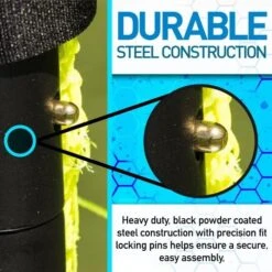 - The steel goal is easy to set up, precision locking pins secure the poles together and galvanized ground stakes that keep the goal attached firmly to the ground.